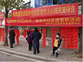 为使广大民众进一步了解我国国粹书法文化,感受新春佳节喜庆的节日氛围,零陵区民政局联合湖南赋寿居养老服务有限公司于2021年1月29、2月1日、2月2日分别在福寿亭社区居家养老服务中心、老渡口社区居家养老服务中心、神仙岭社区居家养老服务中心举办了主题为“乐享国粹书法迎新年”的送春联活动。