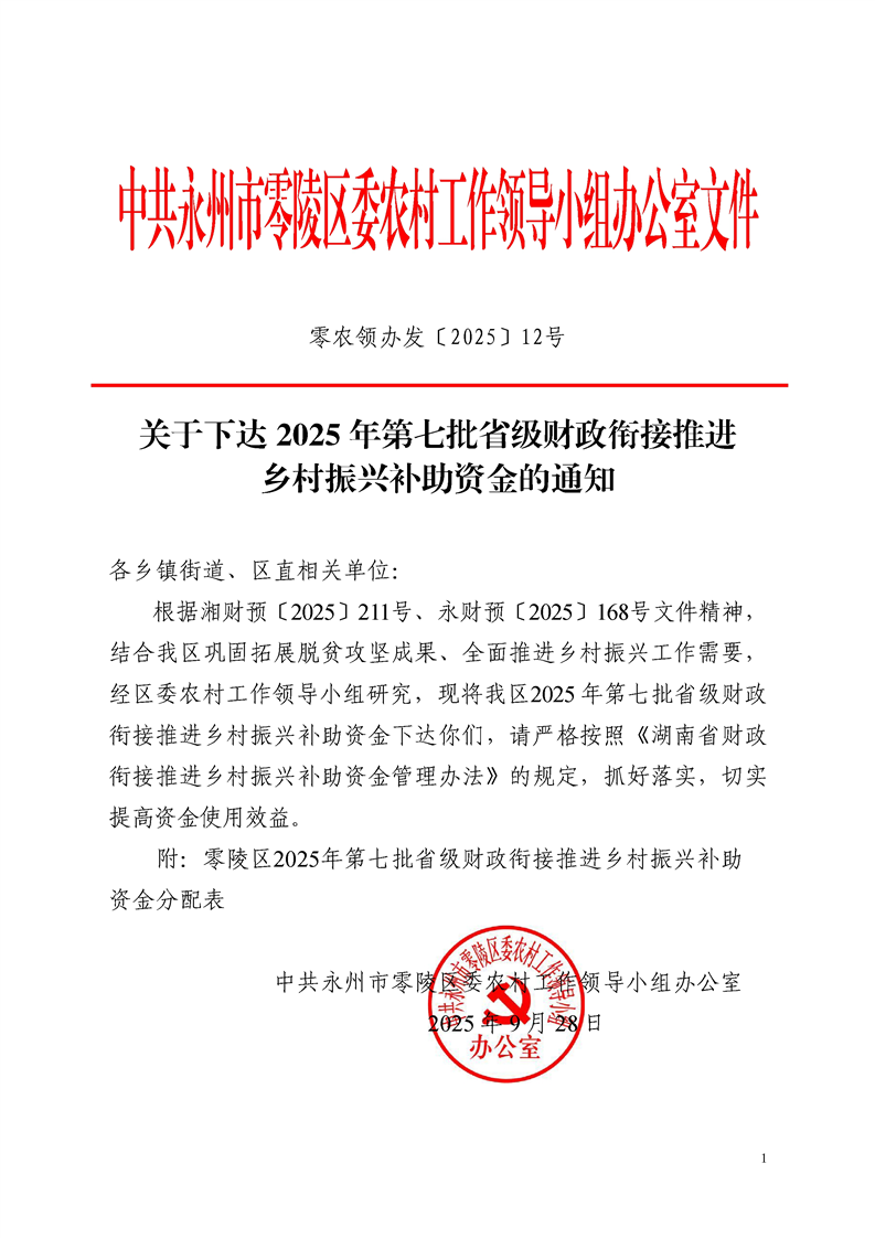 关于下达 2025 年第七批省级财政衔接推进乡村振兴补助资金的通知