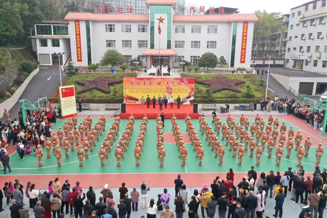 105名潇湘儿郎肩披绶带、胸戴红花,军容严整、英姿勃发。区委常委、区人武部部长蒋崇文宣读入伍命令,区领导为新兵及家长代表佩戴红花、发放“光荣牌”。随后,全体新兵面向军旗庄严宣誓,表达投身国防、报效祖国的坚定决心。
