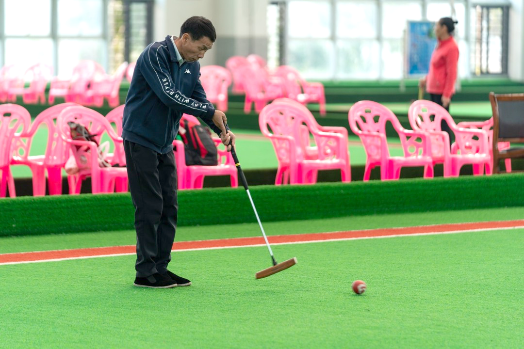 竞赛办法:单人参赛(不限男女),1人1球。发令后,参赛选手从开球区击球,按顺序在球门前方击球通过一门、二门、三门和撞中柱。球不得出界。如球出界,须将球放置在出界点外垂直于边线10厘米处,击回场内。