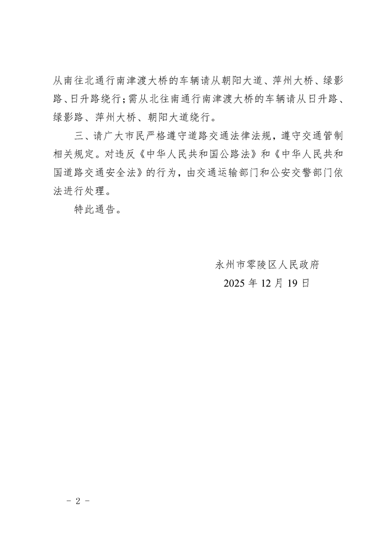 永州市零陵区人民政府关于对南津渡大桥实行交通管制的通告
