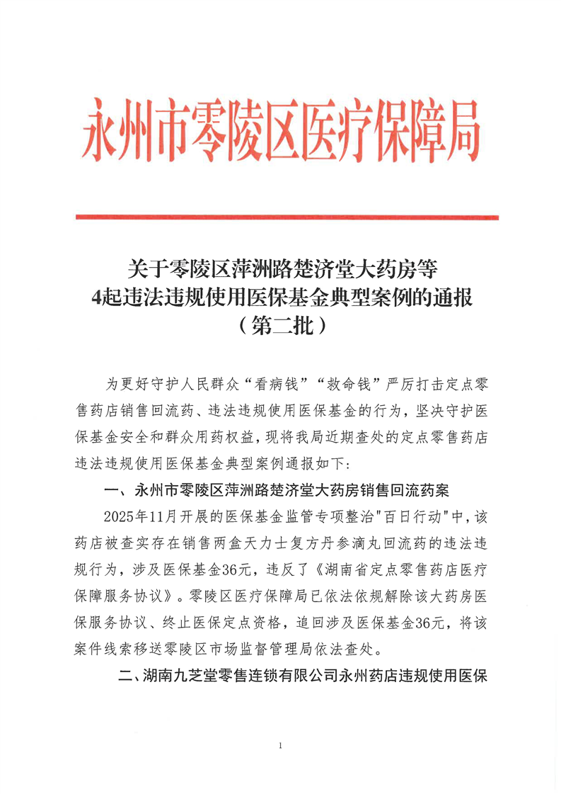 关于零陵区萍洲路楚济堂大药房等4起违法违规使用医保基金典型案例的通报(第二批)