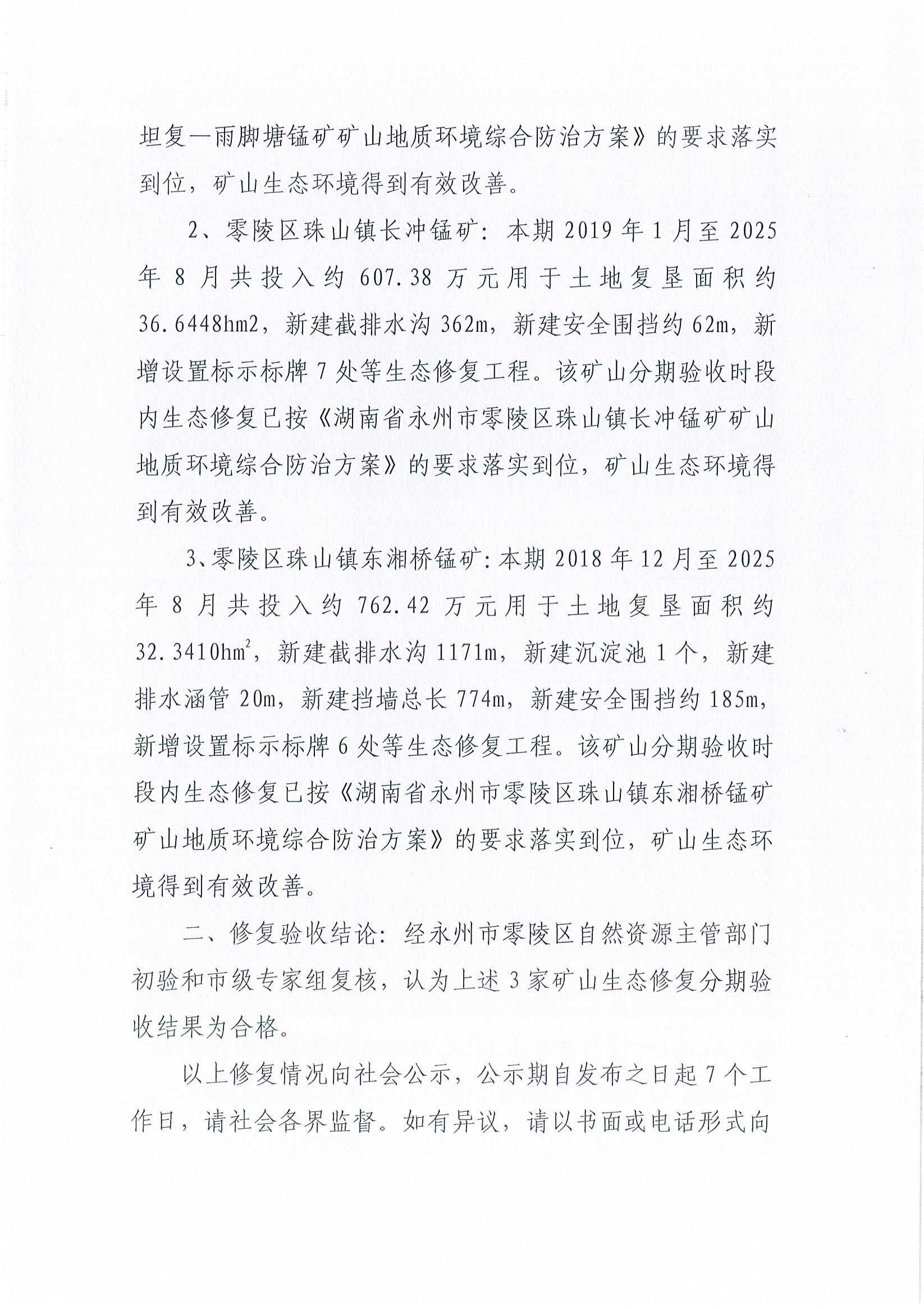 附件:1、《湖南省永州市零陵区锰资源综合开发有限公司坦复-雨脚塘锰矿矿山生态保护修复分期验收报告》