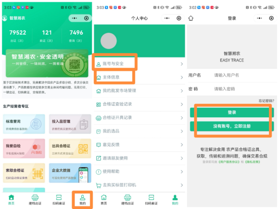 2.使用注册:在“我的”>“账号与安全”菜单,按要求注册,在“主体信息”中上传主体名称、法人、资质证照等信息。