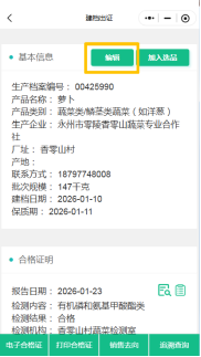 在产品档案,点“编辑”菜单,进入档案记录模块,记录各环节农事活动信息。农事记录为可选项。生产主体可上传检测报告等质量合格凭证。政府抽检合格数据、基地巡检数据将自动关联至该产品档案。