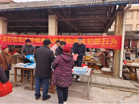 春节将至,为了进一步加强大庆坪乡禁毒宣传工作,提高人民群众识毒、拒毒、防毒能力,营造良好的禁毒氛围,近日,大庆坪乡禁毒办联合大庆坪乡司法所在市场开展禁种铲毒集中宣传活动。