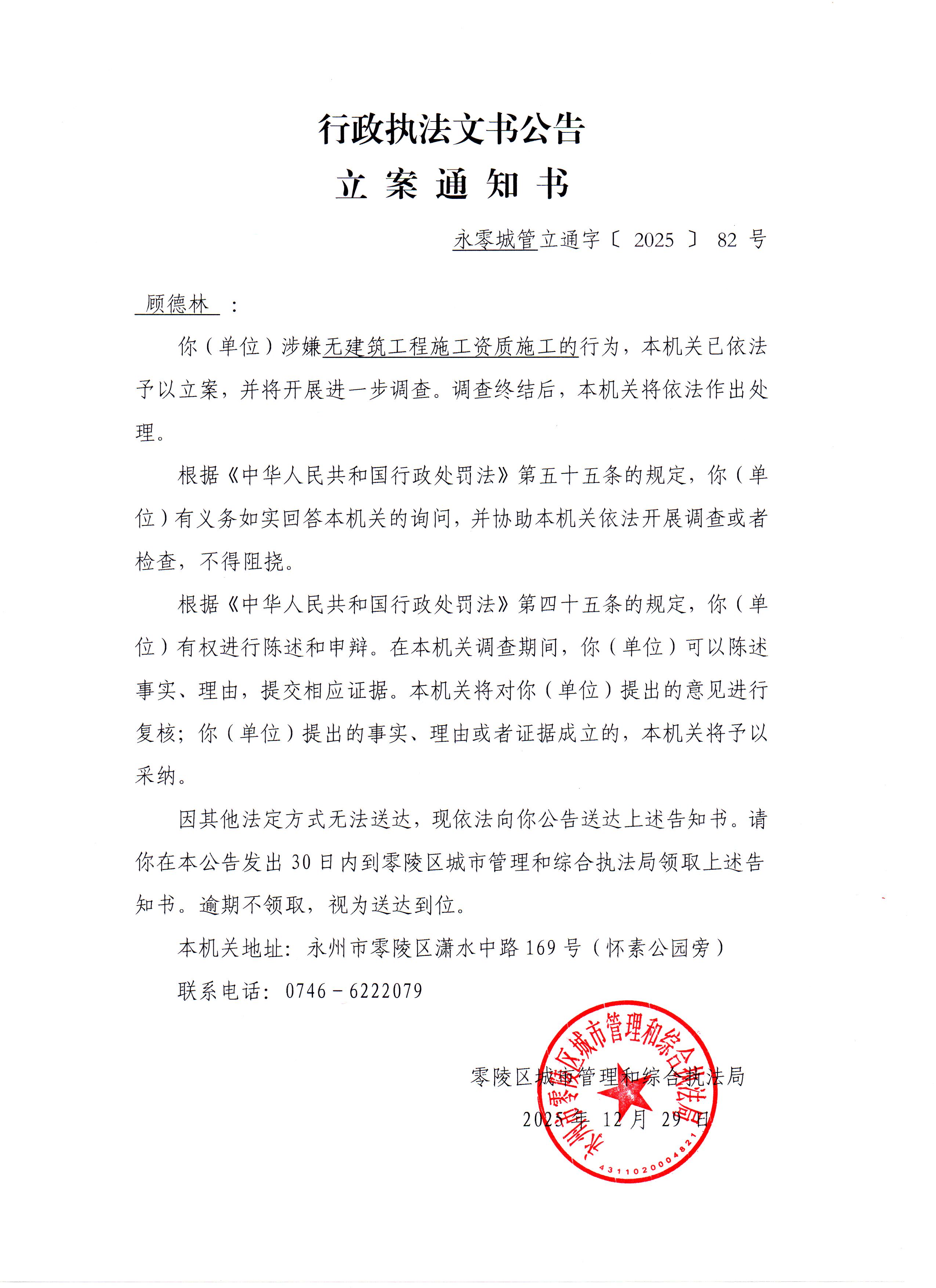 行政执法文书公告立案通知书(永零城管立通字﹝2025﹞82号)(当事人:顾德林)