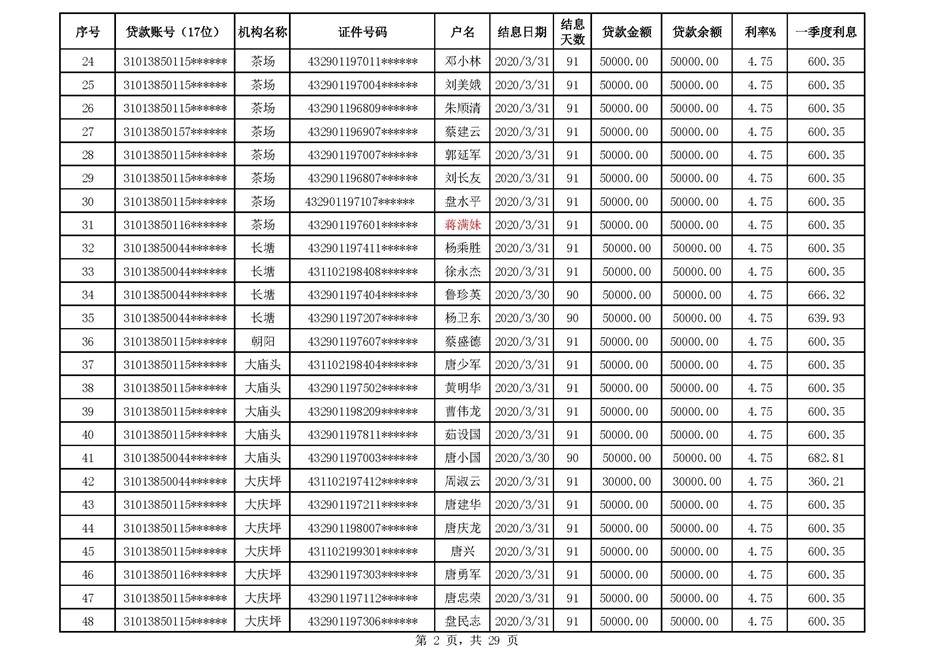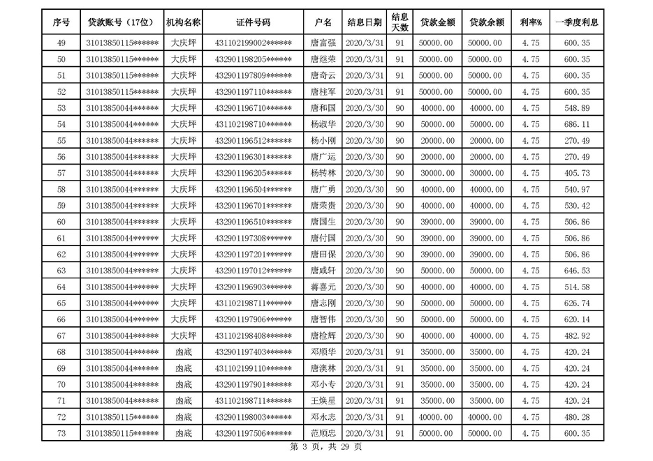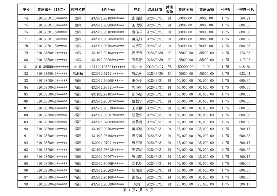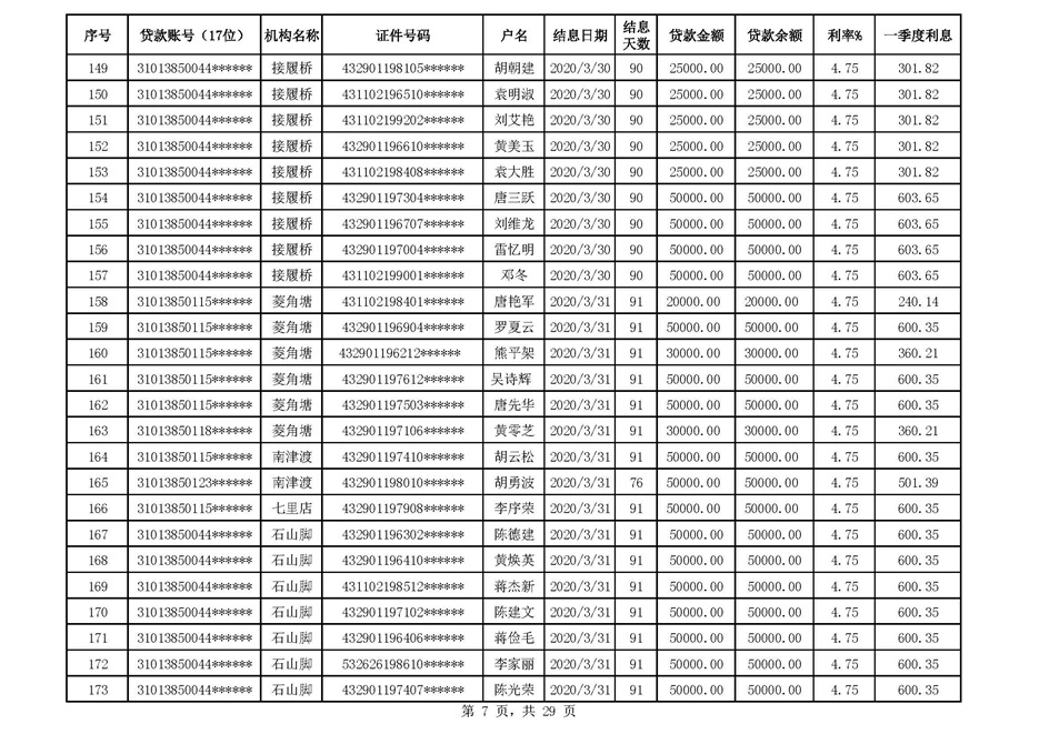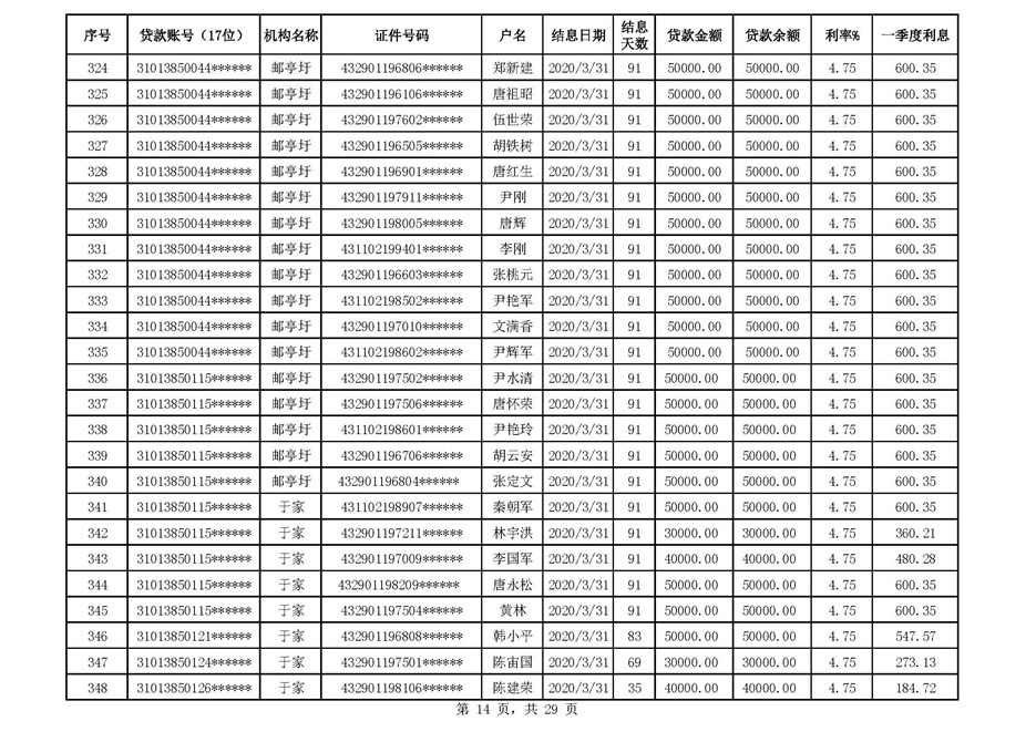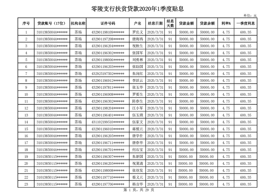 零陵区支行扶贫贷款2020年一季度贴息