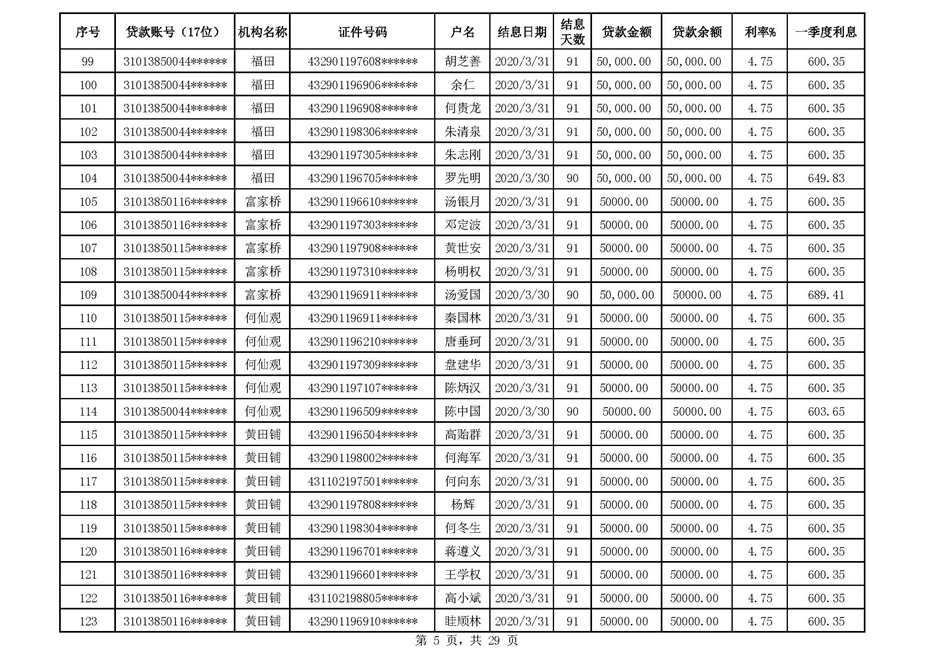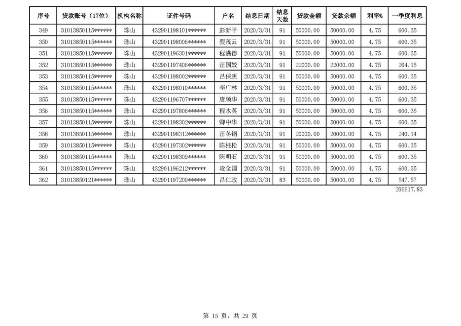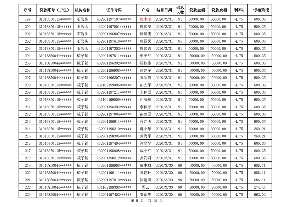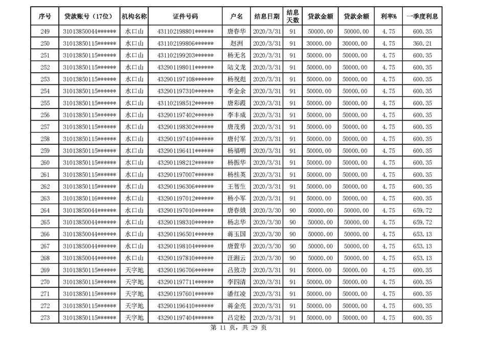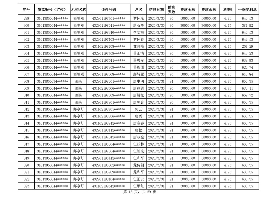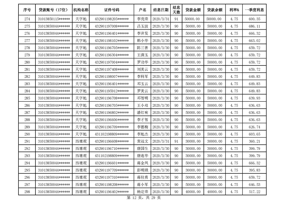 零陵区支行扶贫贷款2020年一季度贴息