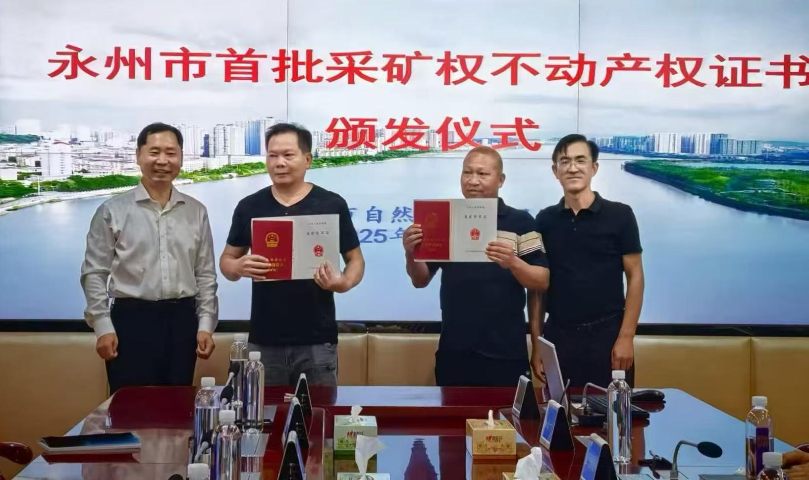 10月16日上午,永州市自然资源和规划局在全省率先颁发市级采矿权不动产权证书,依法为湖南省江华瑶族自治县涛圩镇龙山建筑石料用灰岩矿、湖南省蓝山县太平圩镇华辉建筑石料用灰岩矿采矿权人,核发采矿权不动产权证书和采矿许可证,标志着永州采矿权以“权证分离”新制度取代“一证载两权”旧模式,开启了矿产资源法治化、规范化管理的新篇章。局党组书记、局长龙军出席颁证仪式并讲话。局党组成员、副局长李四清主持颁证仪式。