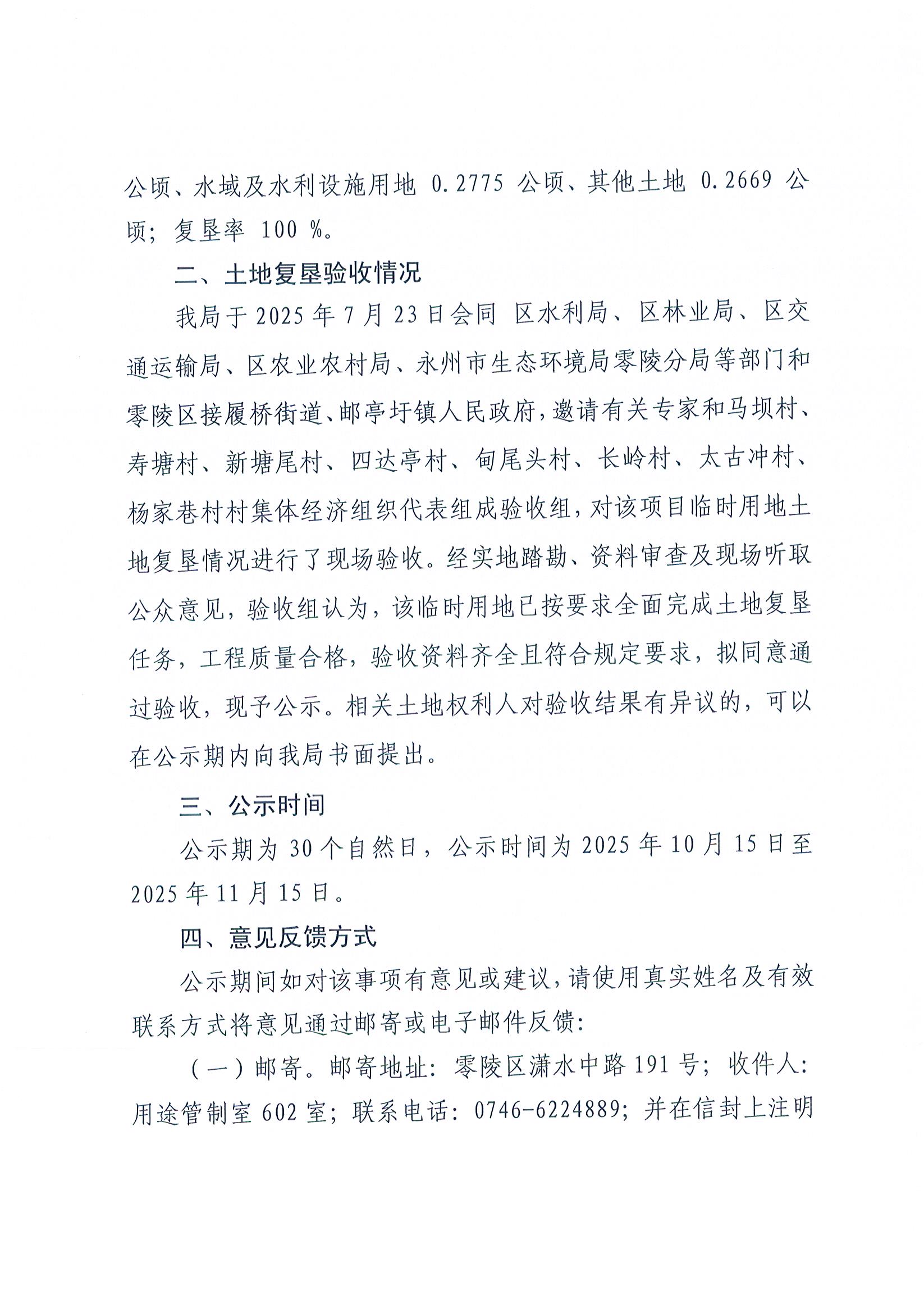 关于永州市门站、次高压管线及高中压调压站工程项目临时用地土地复垦验收结果的公示