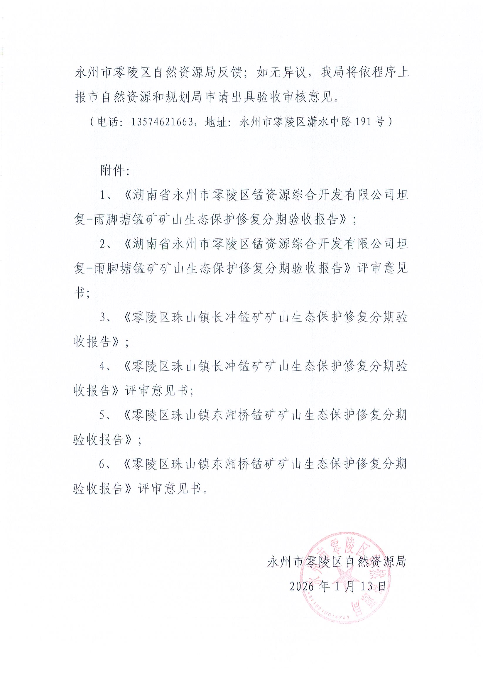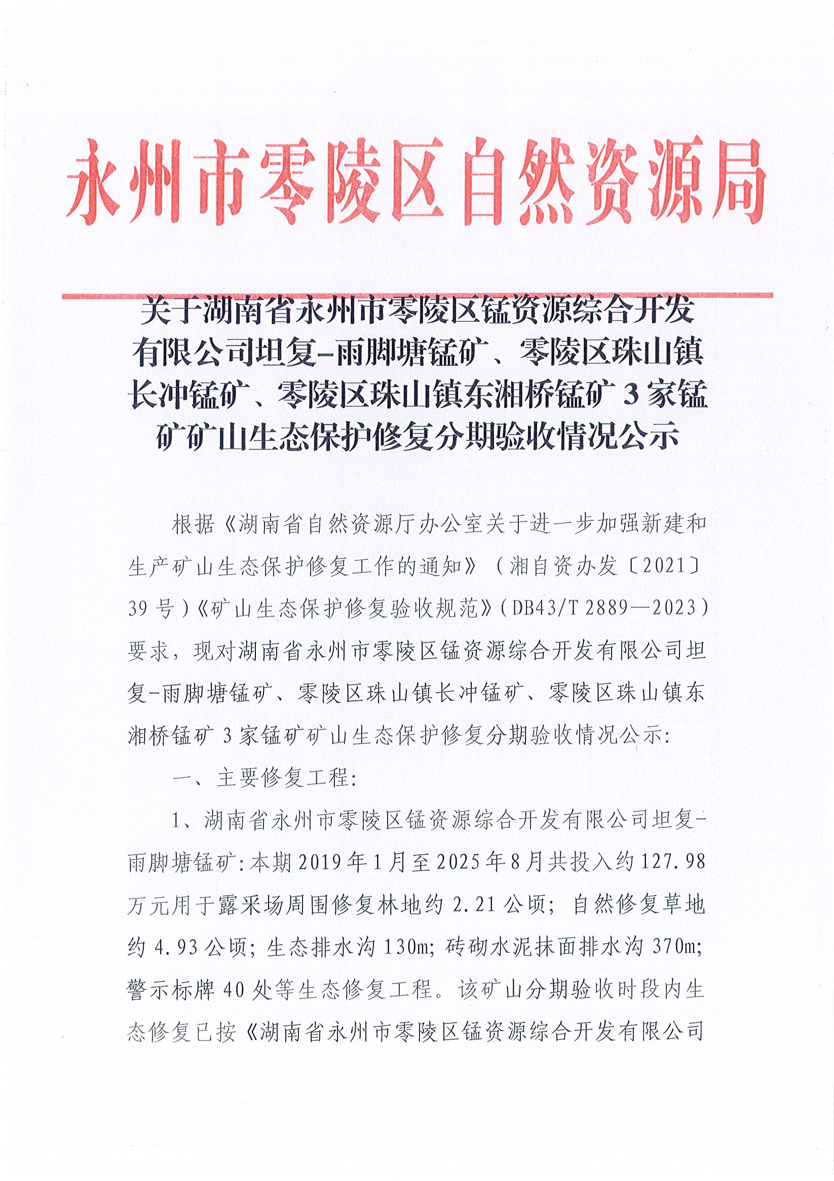1、《湖南省永州市零陵区锰资源综合开发有限公司坦复-雨脚塘锰矿矿山生态保护修复分期验收报告》