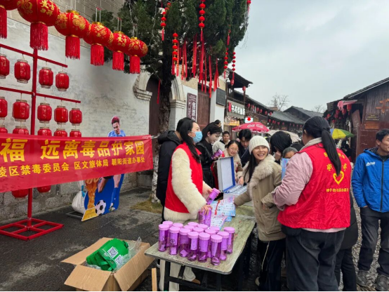在古色古香的零陵古城,禁毒宣传与新春佳节完美融合。红灯笼下,“平安过年享幸福,远离毒品护家园”的横幅格外醒目;摊位前,市民们踊跃参与,领取宣传资料和小礼品,现场气氛热烈。