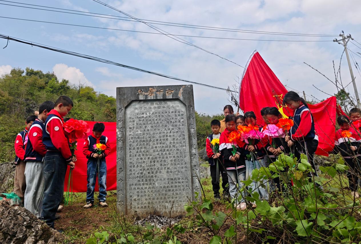 党员教师与少先队员们手持纸花,向革命先烈深深鞠躬、默哀致敬,以最朴素的方式表达对先烈的无限崇敬与深切哀思。随后,在大队辅导员唐玲芳的带领下,学习了抗日英雄唐吉华等革命先辈的英勇事迹。此次活动以“党建带队建”为纽带,通过“大手牵小手”的形式,让红色教育在实践中落地生根,既强化了党员教师的使命担当,也厚植了少先队员的爱国情怀,为培育担当民族复兴大任的时代新人注入了强大精神动力。