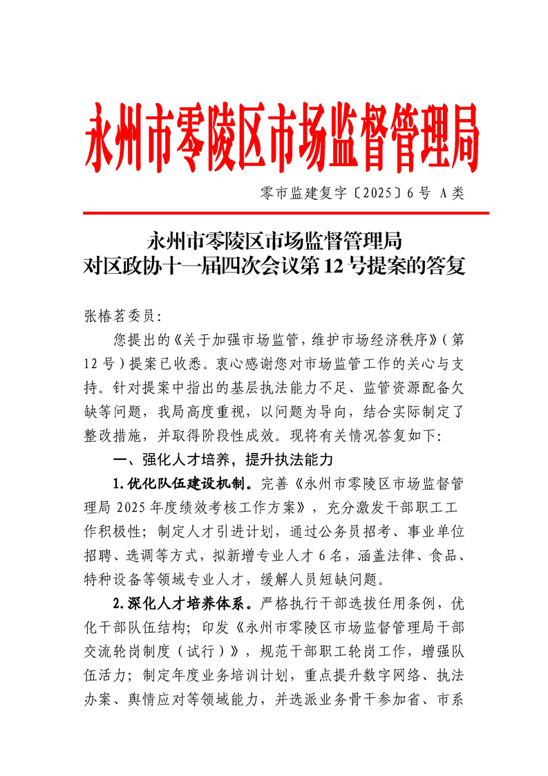 永州市零陵区市场监督管理局对区政协十一届四次会议第12号提案的答复