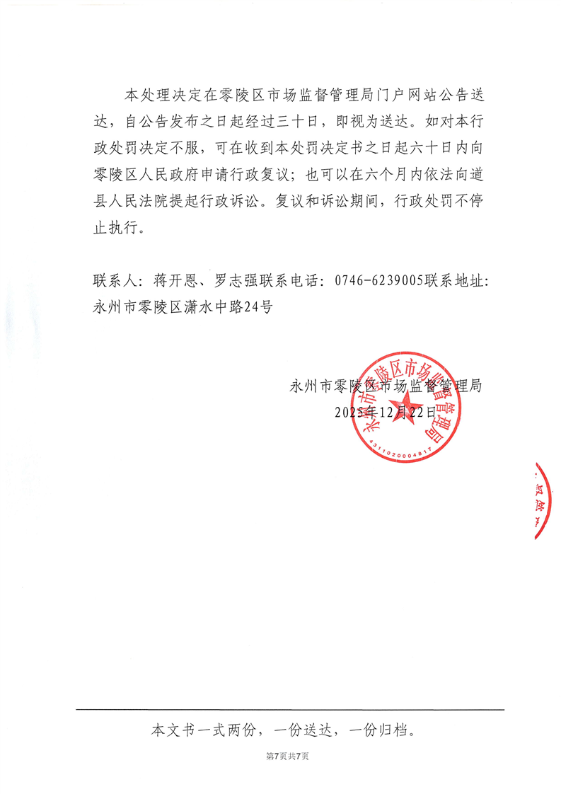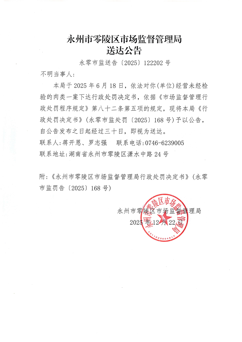 永州市零陵区市场监督管理局 送达公告 永零市监送告〔2025〕122202号
