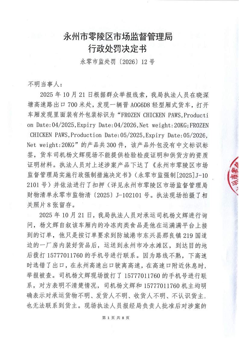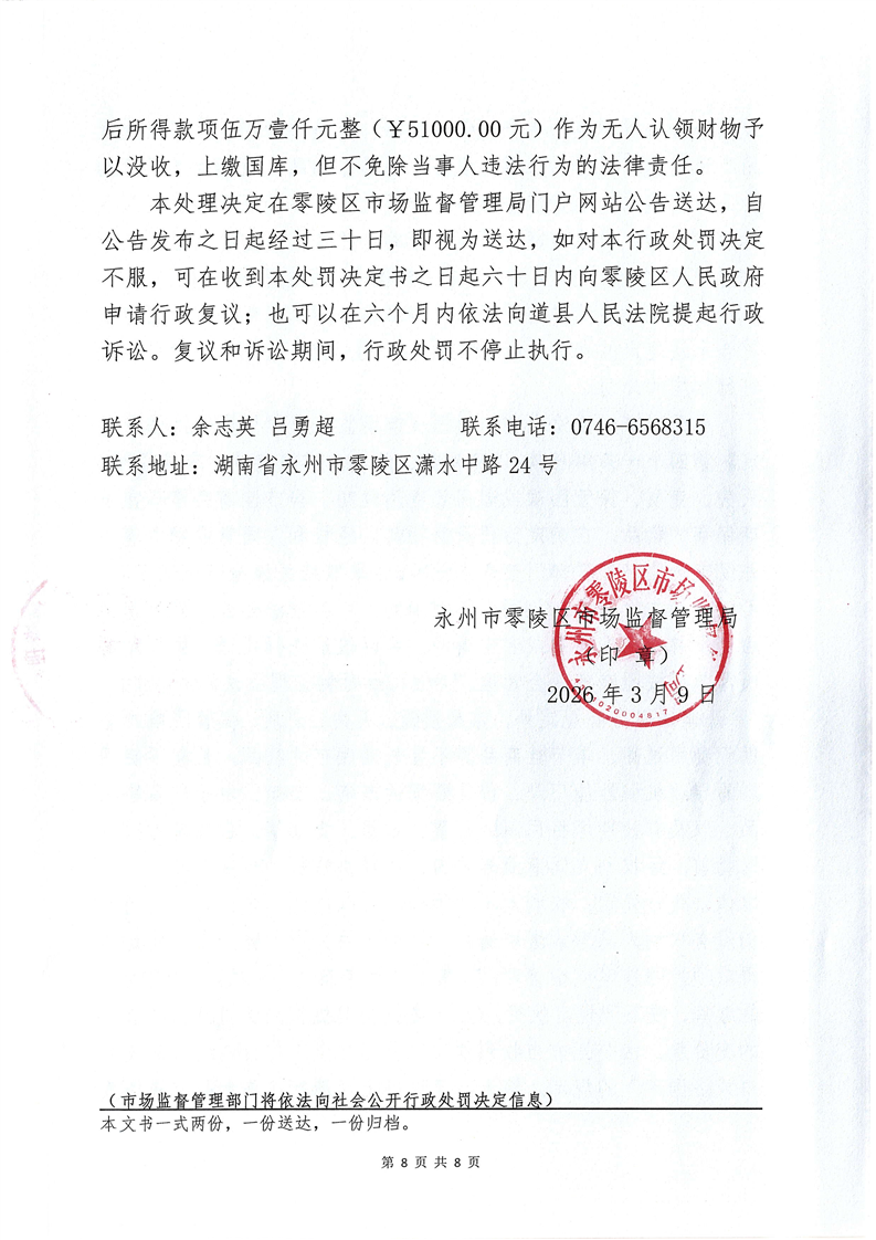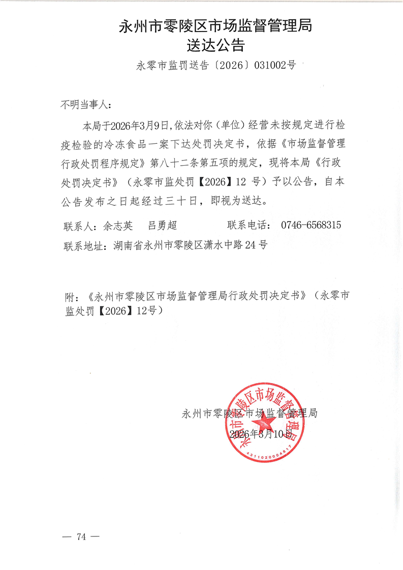 永州市零陵区市场监督管理局 送达公告 永零市监罚送告(2026)031002号